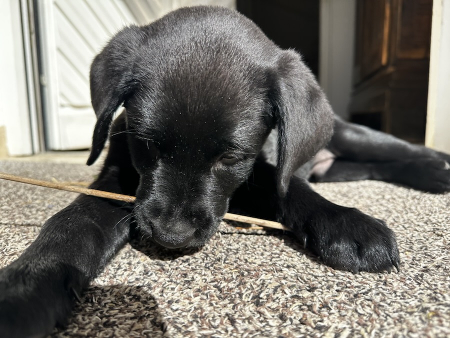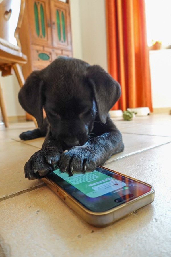 Unser Finn entwickelt sich prächtig- er wird von Tag zu Tag mutiger und selbstbewusster. Ein kleiner Schlingel, der sich über ein Blatt, dass vom Wind weggeweht wird, so freuen kann und dass mit kleinen Bocksprüngen verfolgt und „gefangen“ wird.