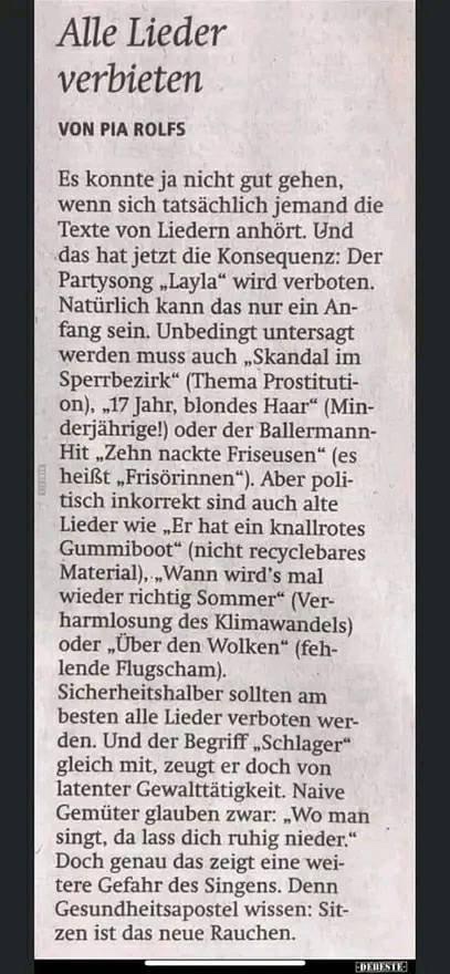 Diesen Artikel hab ich vor kurzem in irgend einer Zeitung gelesen und ich frage mich wirklich: Haben wir im Moment keine anderen Probleme? Wie kann man in der heutigen Zeit noch so verklemmt sein? Wer es nicht hören will, der schaltet sein Radio aus oder verlässt meinetwegen das Bierzelt. Haben wir nicht 1975 – ausgeschrieben – neunzehnhundertfünfundsiebzig von den Besoffskis: Ole, wir fahrn in Puff nach Barcelona gehört und mitgesungen? (Ich hab damals 10-jährig verstanden und gesungen: Ole wir fahrn nach Bufdebarzelona….beim Nachfragen, wo den Bufdebarzelona ist, wurde mir eindringlich erklärt, das nicht sooo laut zu schmettern, es wäre ein ’nicht so anständiger Ort‘ 🙂 Wann haben wir eigentlich verlernt, über uns selbst zu lachenn?????
