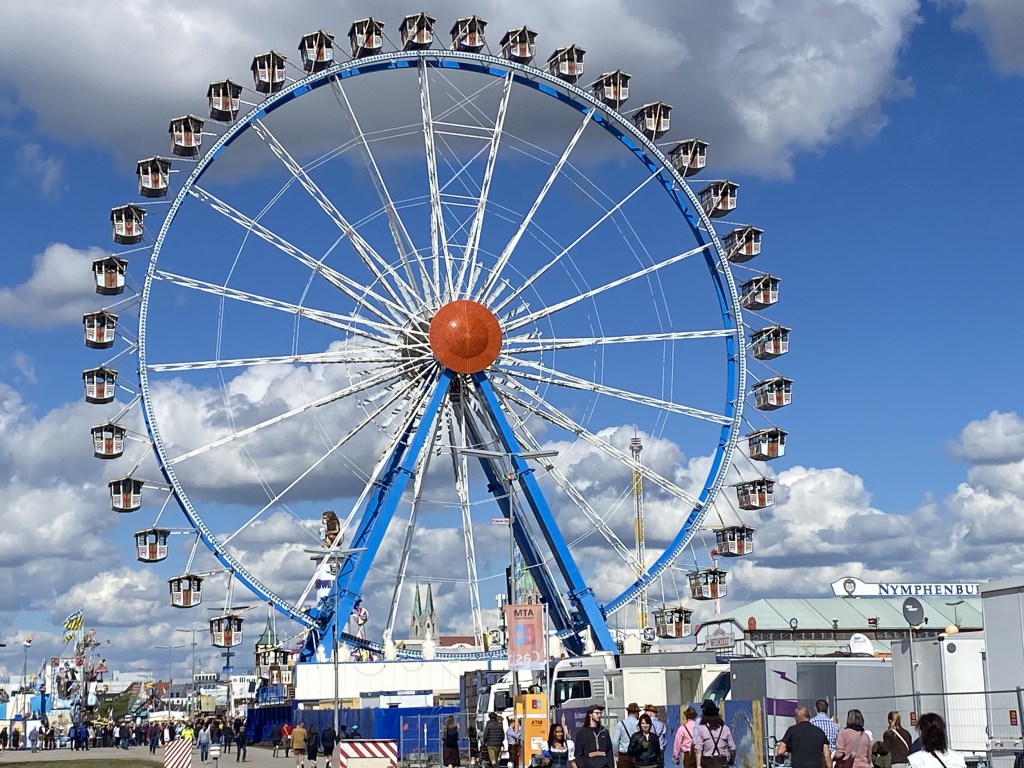 Am Mittwoch war ich mit Männe mittags dort. Ganz entspannt sind wir mit der Ubahn angekommen, ohne daß wir schon beim Rausgehen aus der Ubahn in einem Strom Menschen Richtung Ausgang geschoben wurden. Viele Karussells hatten noch geschlossen, in den Schaustellerstraßen konnte man sich noch gut bewegen. Wir bummelten entlang der Buden und Stände, Karussells und ließen es uns nicht nehmen, zumindest einmal im Riesenrad gesessen zu haben. Aber 10 Euro für eine Fahrt – meine Herren.