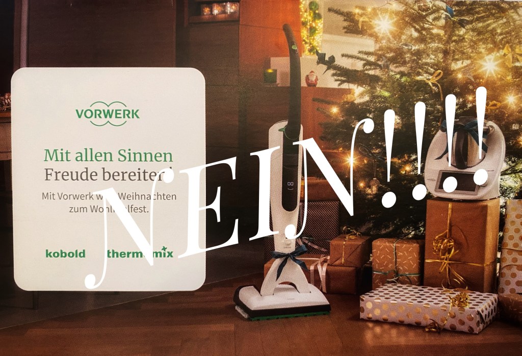 Gestern in unserem Briefkasten – eine Art Weihnachtskarte mit einem Gutschein „20 EURO WUNSCHERFÜLLER“ – den ich für einen Thermomix (Anschaffungspreis ab 1.100,00 Euro) oder einem Staubsauger (ich glaube, die gibt es für unter 1.000,00 Euro) einlösen kann. Toll….