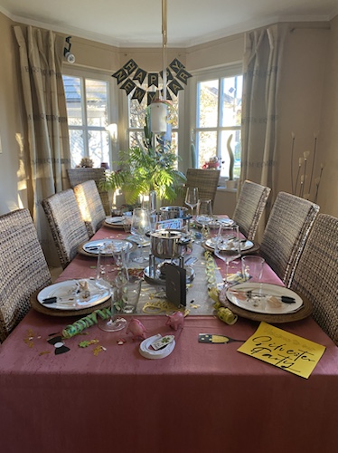 Dafür ist unser Eßzimmer für morgen schon fertig dekoriert – wir feiern morgen mit zwei befreundeten Paaren. Bei uns gibts traditionell Fleischfondue – da kann man schön lang „hinessen“. Vor Jahren haben wir es gerade so geschafft, den Fonduetopf noch vor Mitternacht vom Tisch zu bekommen.