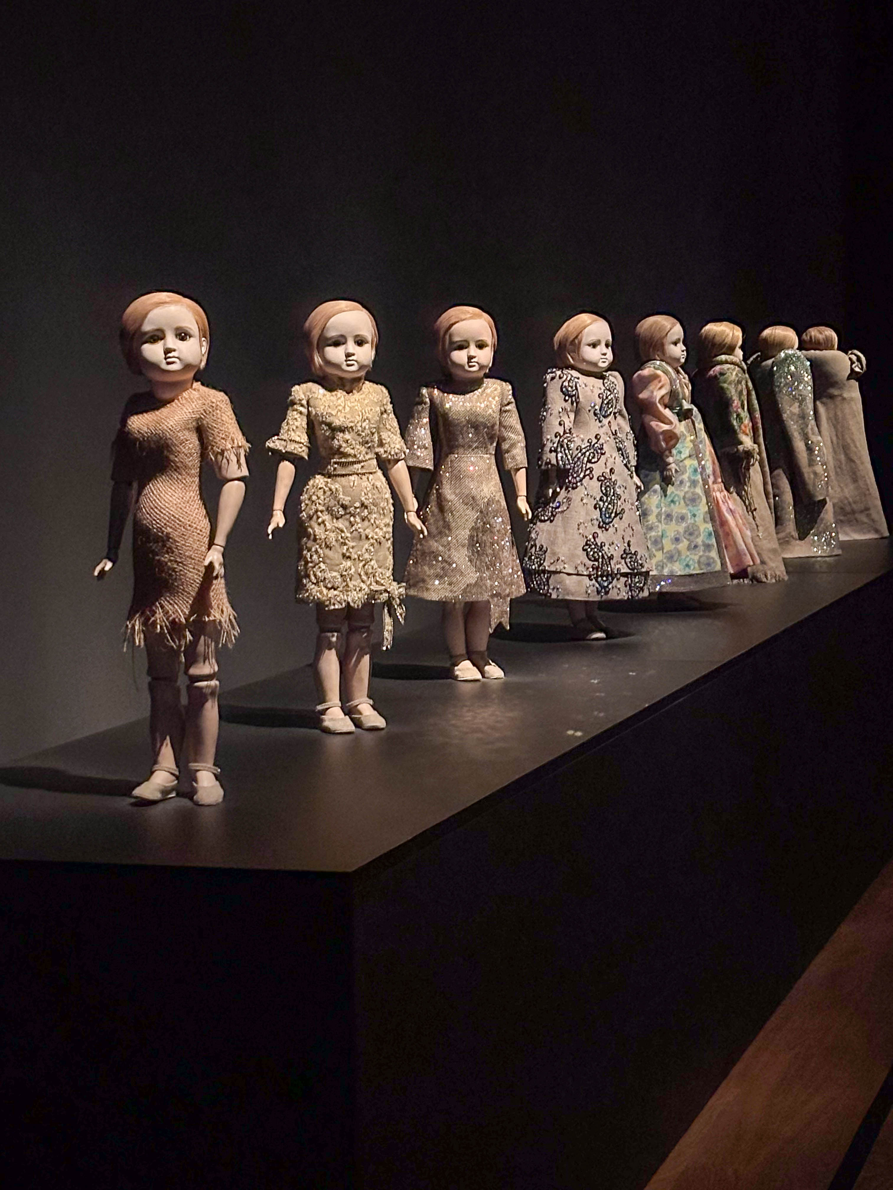 Hierzu gab es ebenfalls einen kleinen Film: Das Model stand auf einer sich drehenden Scheibe und hatte als erstes „Kleid“ das an, was die erste Puppe auf dem linken Foto trug – ich hätte es als Sackleinen deklariert, wäre aber mit dieser Bezeichnung von Viktor und Rolf ziemlich sicher sofort entlassen worden:).