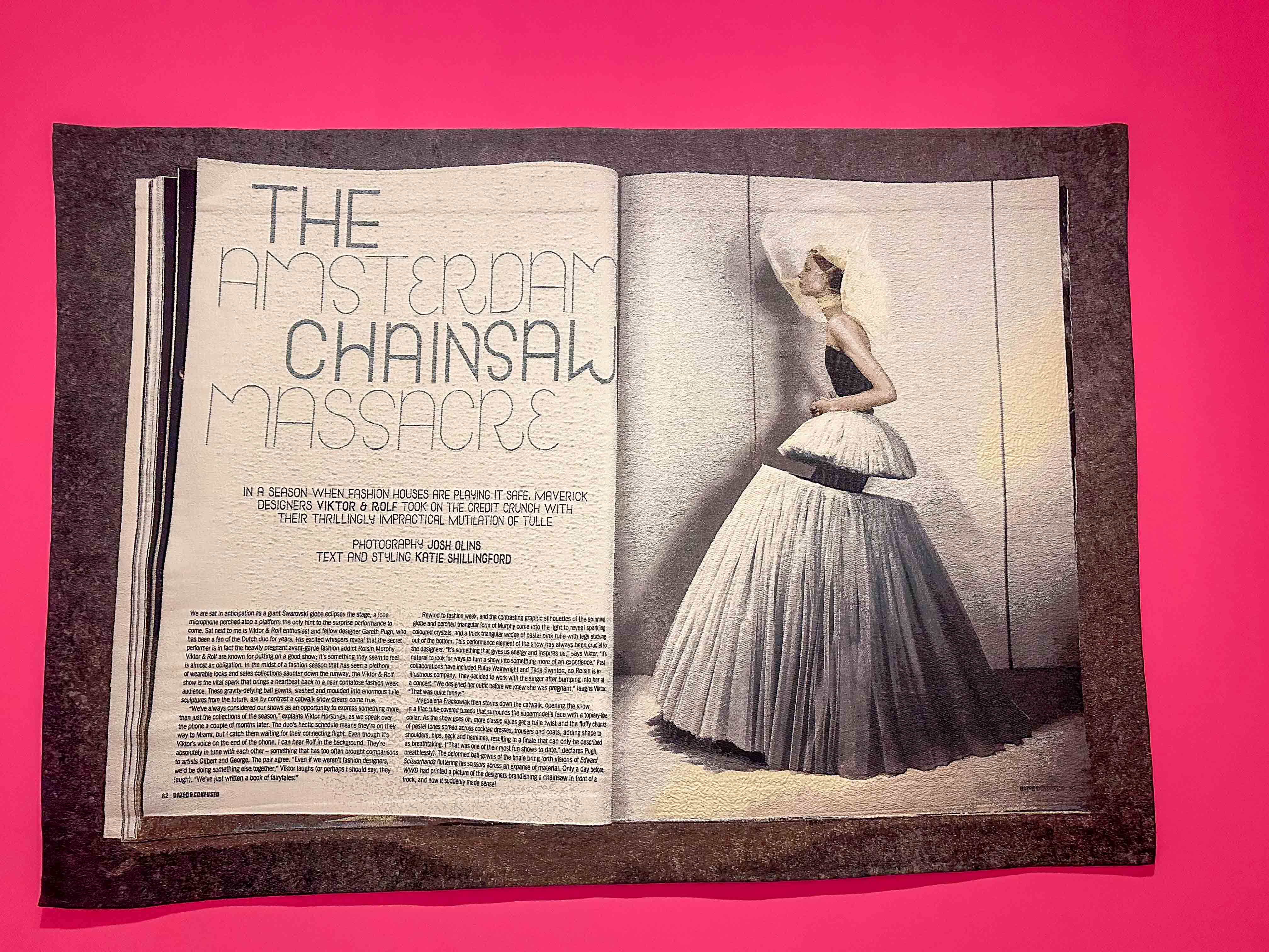 Und auch Zeitungsausschnitte verewigten die beiden auf eine ganz spezielle Art – als Teppiche bzw Wandbilder – das sind wirklich Stoffe: