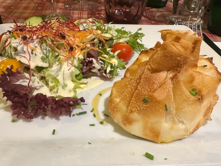 Abendessen gabs dann im „Chez Hansi“ – sehr urig und sehr traditionell – tolle Stimmung, flotte Bedienung, sehr gut besucht und das Essen ausgezeichnet. Ich hatte einen gebackenen Schafskäse im „Mantel“ und Salat – göttlich, sag ich euch: