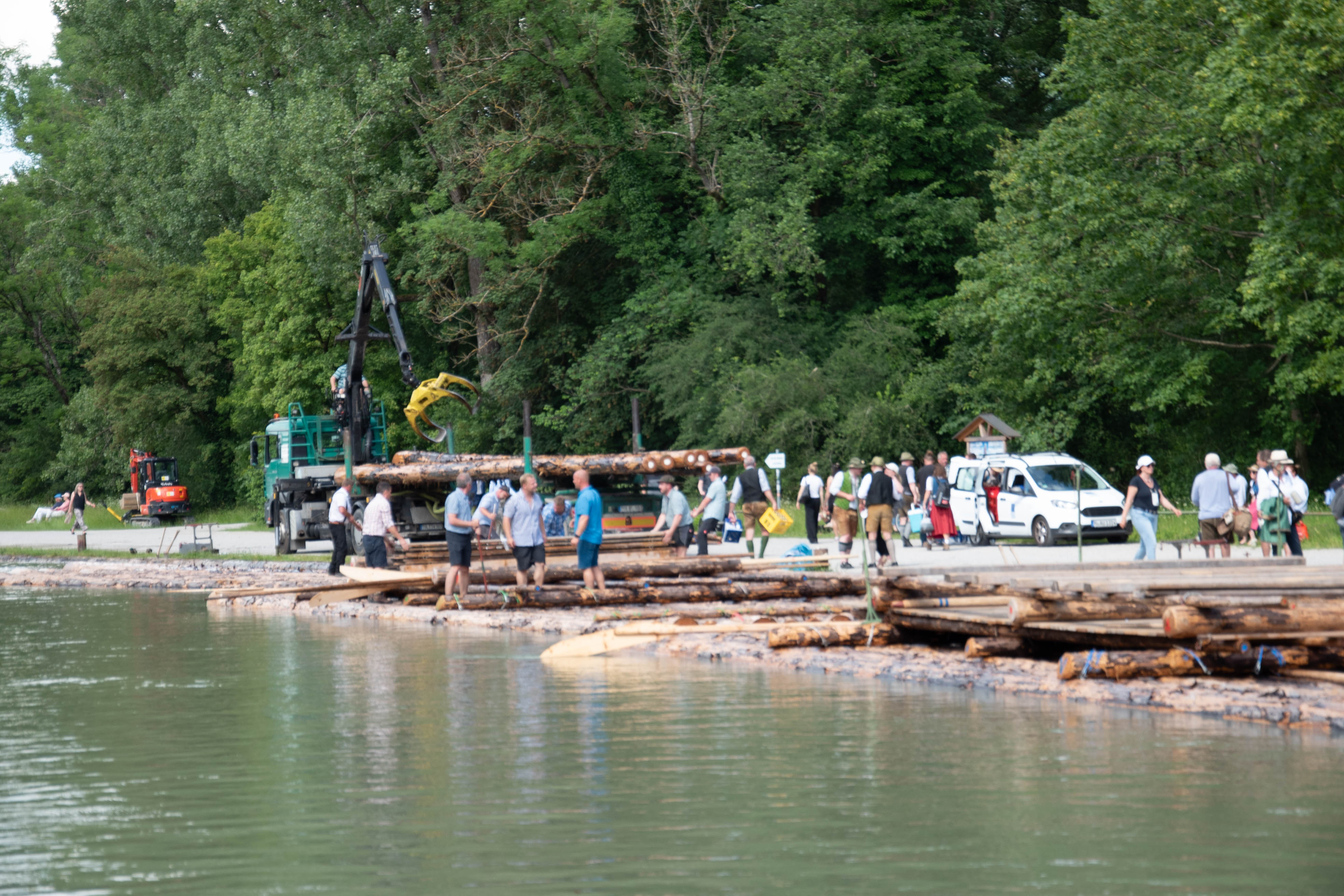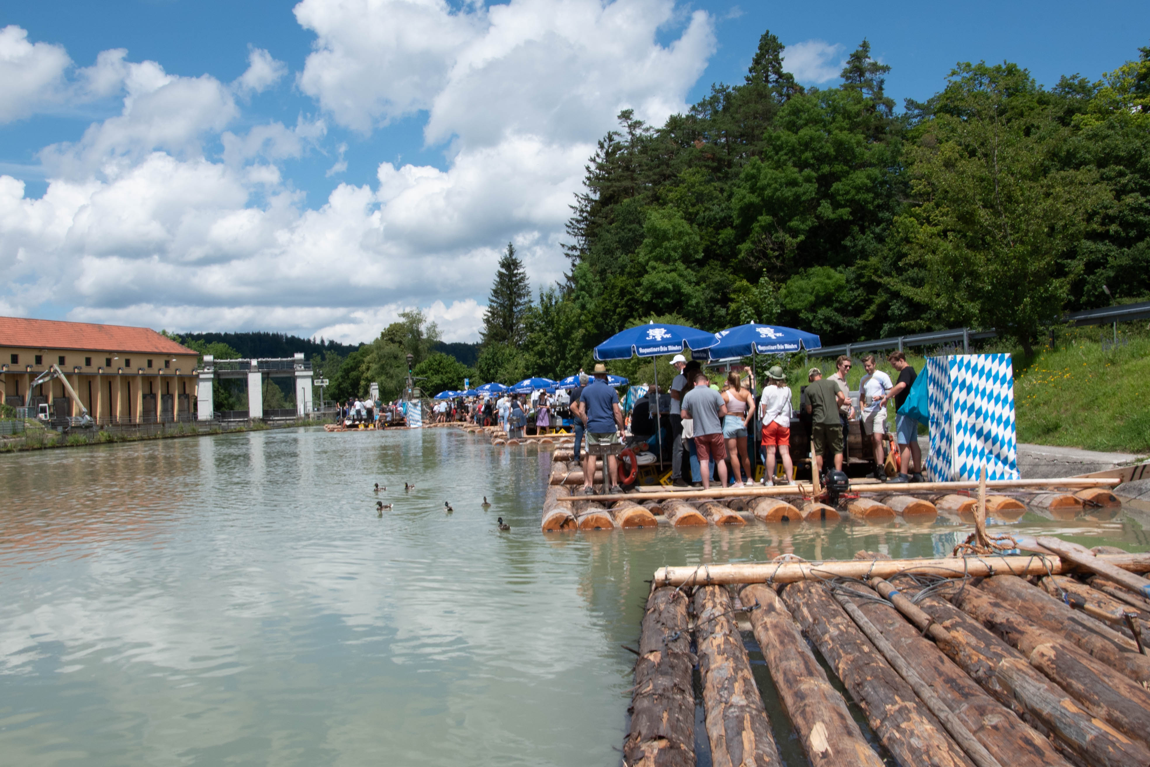 25 Flußkilometer in knapp 4 Stunden – das war recht flott, da die Isar noch ziemlich viel Wasser vom Hochwasser Anfang Juni hatte. In Thalkirchen an der Floßlände werden die Flöße dann wieder „auseinandergenommen“ und auf LKW verladen und dann wieder zurück gefahren.