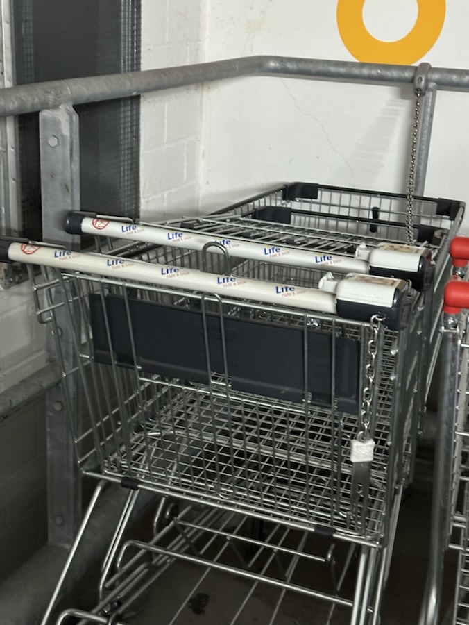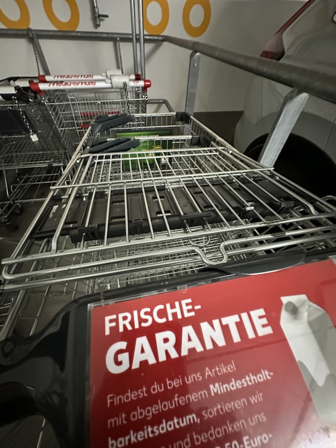 Viele sind dann einfach so entnervt, die lassen die Einkaufswagen dann einfach so da stehen, manche hängen falsch rum ineinander, manche haben gar keine Kette, manche sind dann einfach so dort abgestellt, man kann noch den Plastikchip oder den Euro sehen – die Menschen sind einfach nur genervt und lassen die Karren dann eben da und verzichten auf ihren Euro.