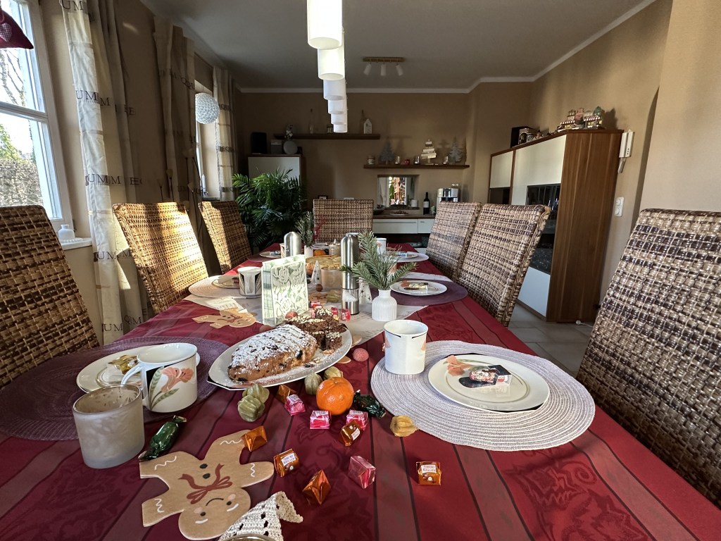 Am 25.12. habe ich noch schnell einen Schmandkuchen gebacken und die Tafel für 7 Personen gedeckt und Mon Cherie, Ferrero Küsschen, Kumquats, Litschis und Physalis als essbare Deko auf dem Tisch verteilt.