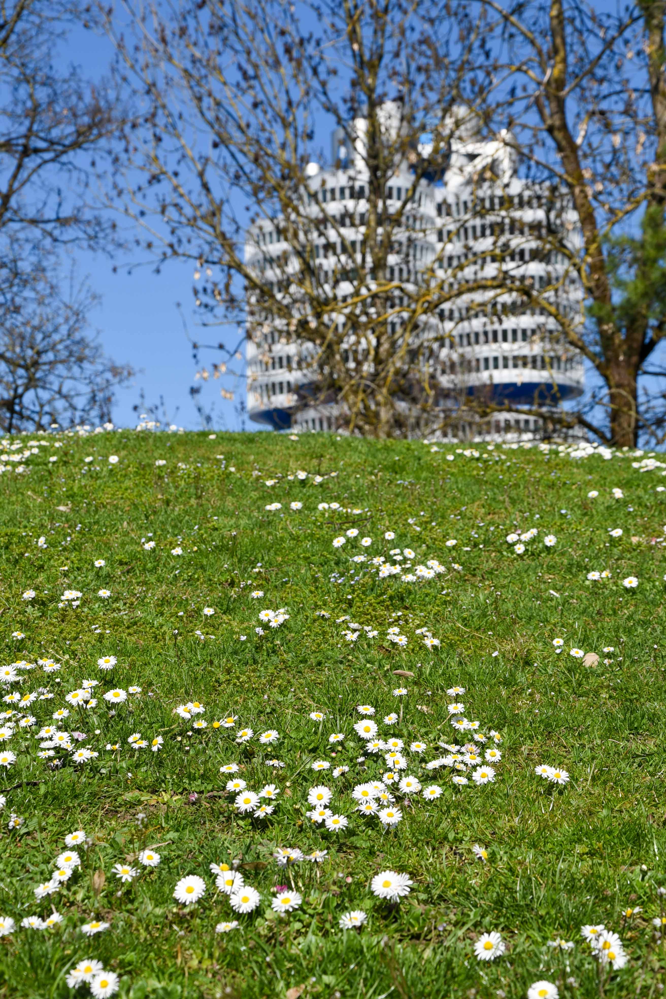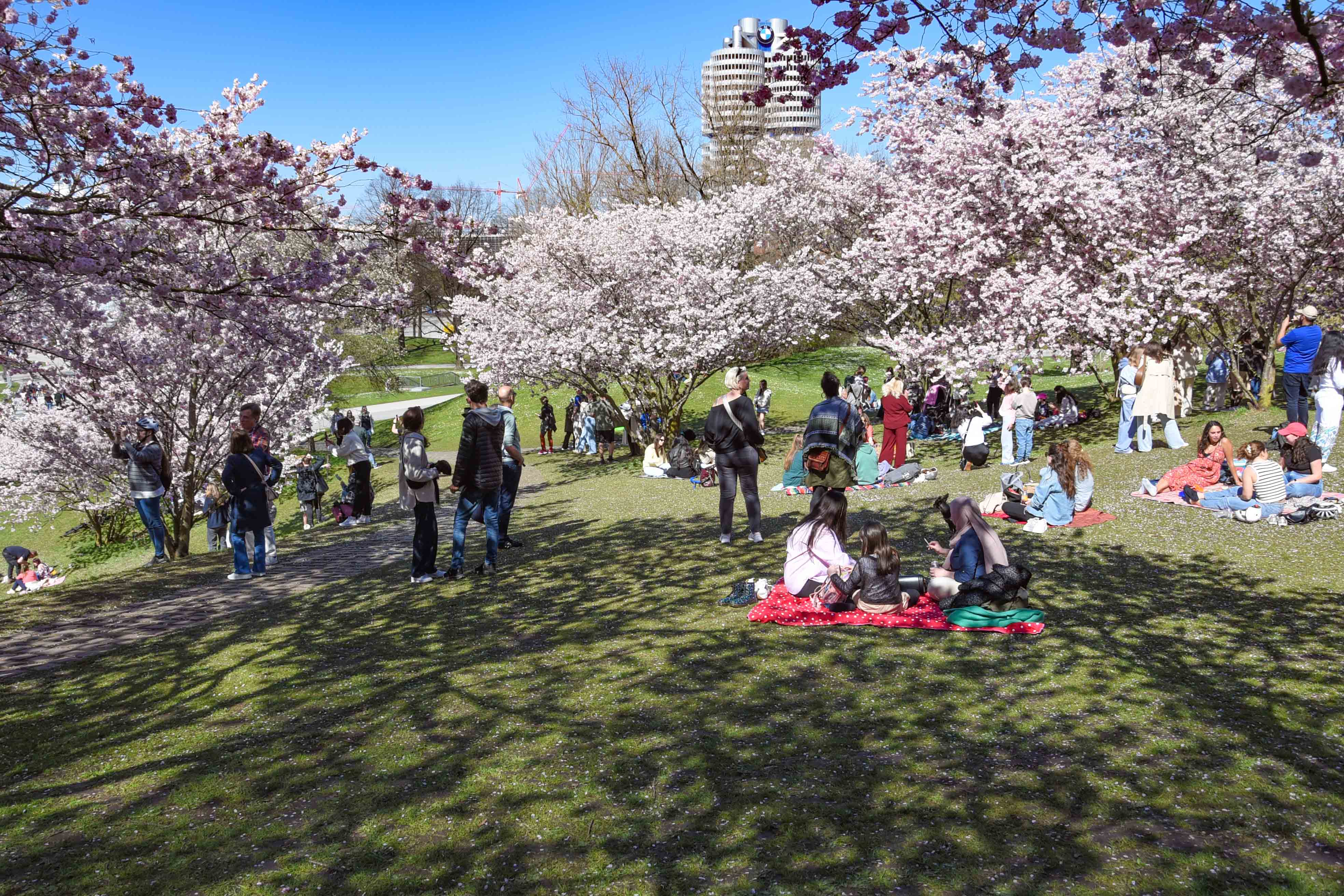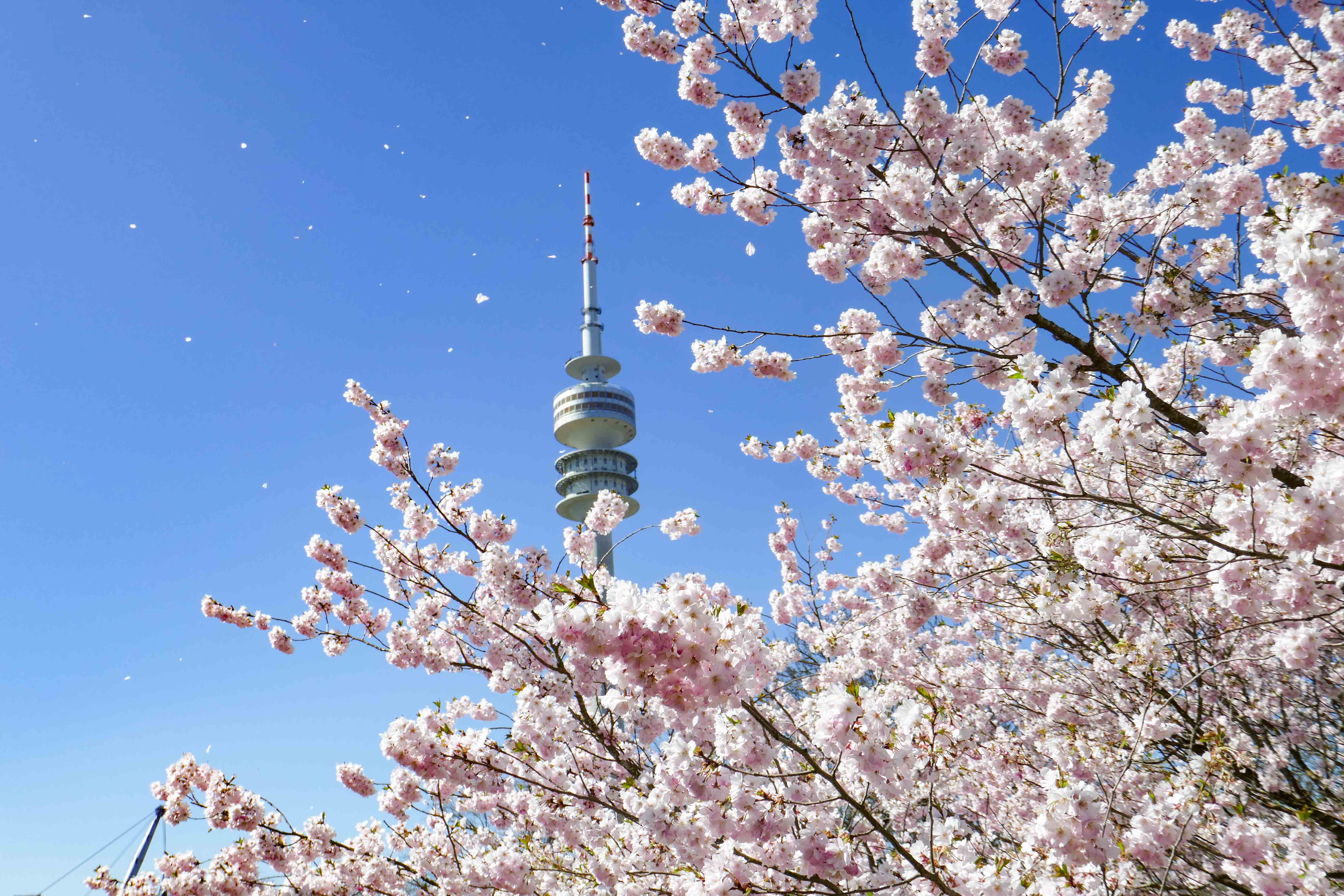 Und zwischen den Kirschbäumen dann noch der Blick auf den Olympiaturm und das BMW Hochhaus: