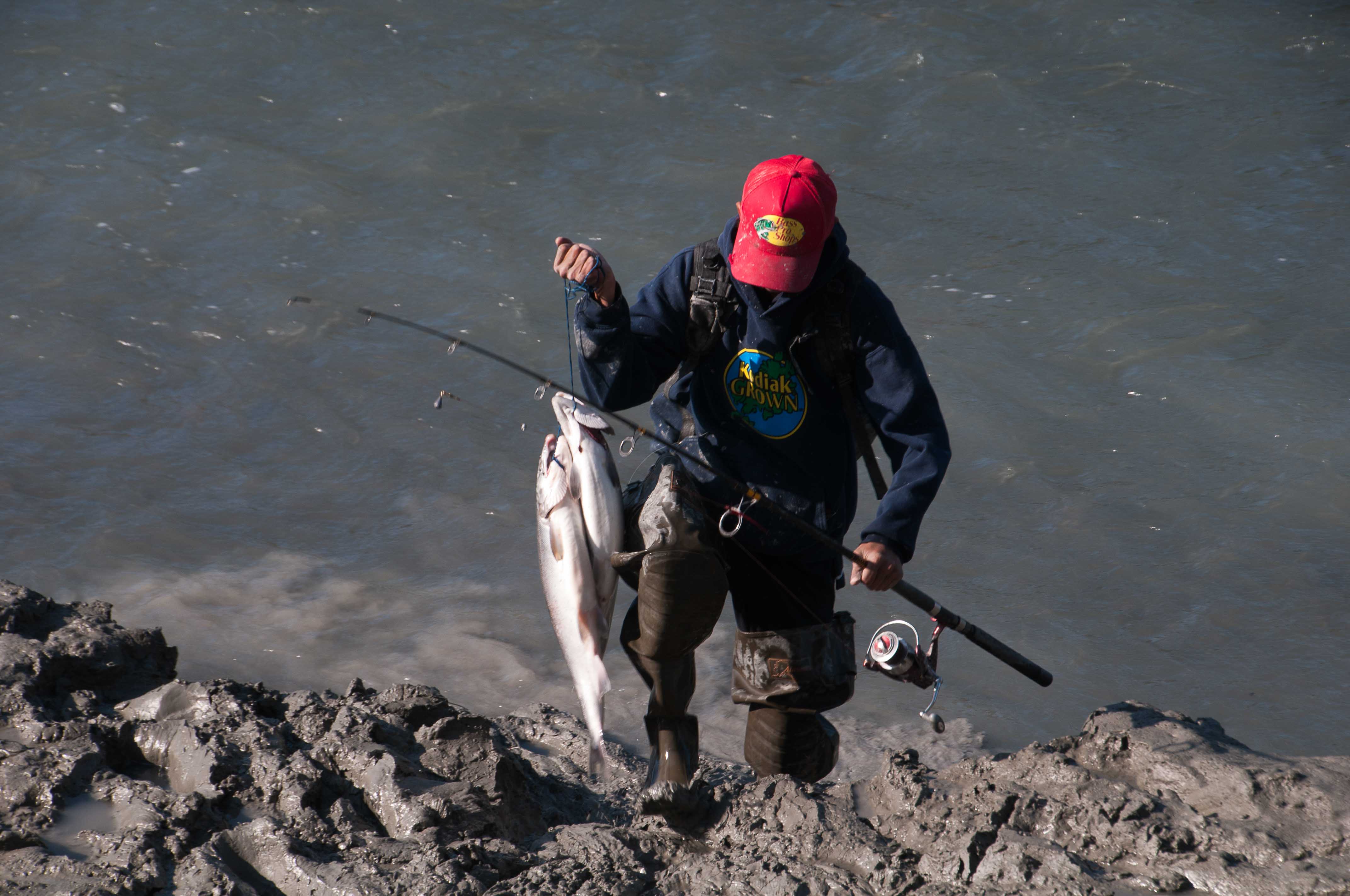 Ich habe nichts gegen Angeln, ich esse auch gerne Fisch. Aber wie der Lachs hier getötet wurde, konnte ich mir nicht lange anschauen. Man angelt ihn und holt dann den Haken aus dem Maul, dann wirft man ihn auf die Erde und tritt drauf – nochmal – und wenn er dann immer noch zappelt, tritt man eben noch drei bis fünf mal drauf. Anstatt hier kurz und relativ schmerzlos zu töten, lebte der Lachs noch minutenlang. Fanden wir furchtbar.