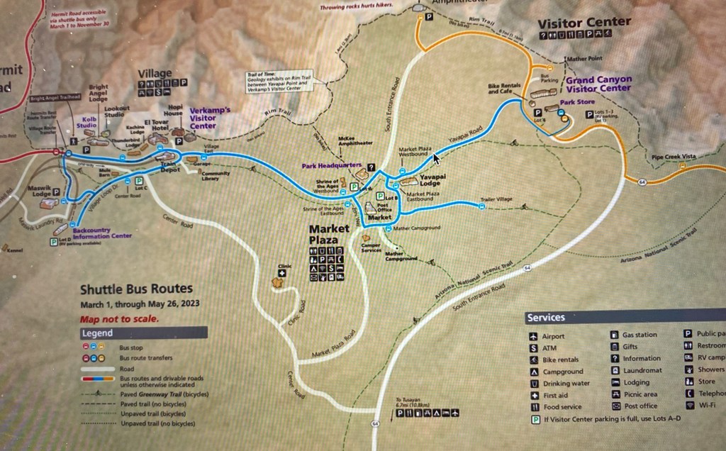 Wir sind noch zur Bright Angel Lodge gelaufen – haben uns dort mit einem leckeren Burger gestärkt und dann nochmal mit dem Bus – der „Red Line“ eine Aussichtsfahrt. Und wieder gab es andere Ausblicke und Anblicke. Nach dem Ende der Busfahrt Schock: Achims Kamera ist weg – wir nochmals zur Bushaltestelle getrabt und der nette Busfahrer hatte sie gesichtet und auf die Seite geräumt. Abends waren wir platt – diese Eindrücke! Es gab noch ein schnelles Abendessen und dann rein in die Kissen.