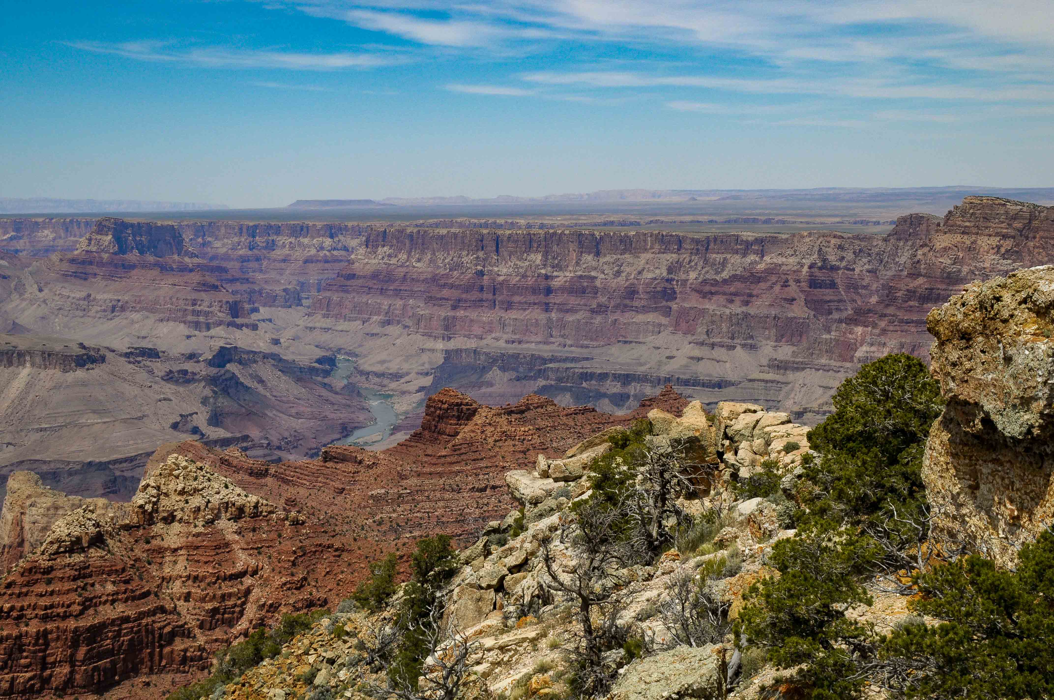 Nachdem wir Nevada verlassen hatten und auf der Route 66 waren, kamen wir nach ca 4 Stunden im Grand Canyon Nationalpark an. Die Fahrt war unbeschreiblich schön – weit und breit nichts – Weite und etwas Steinwüste. Unfassbar schön. Unsere Lodge – El Tovar – fanden wir auch ziemlich schnell. Ein wunderschönes altes Gebäude, 1905 gebaut und im Jahre 2005 renoviert. Selbst Albert Einstein und Theodore Roosevelt haben hier schon übernachtet und die fantastischen Blicke über den Canyon genießen können.