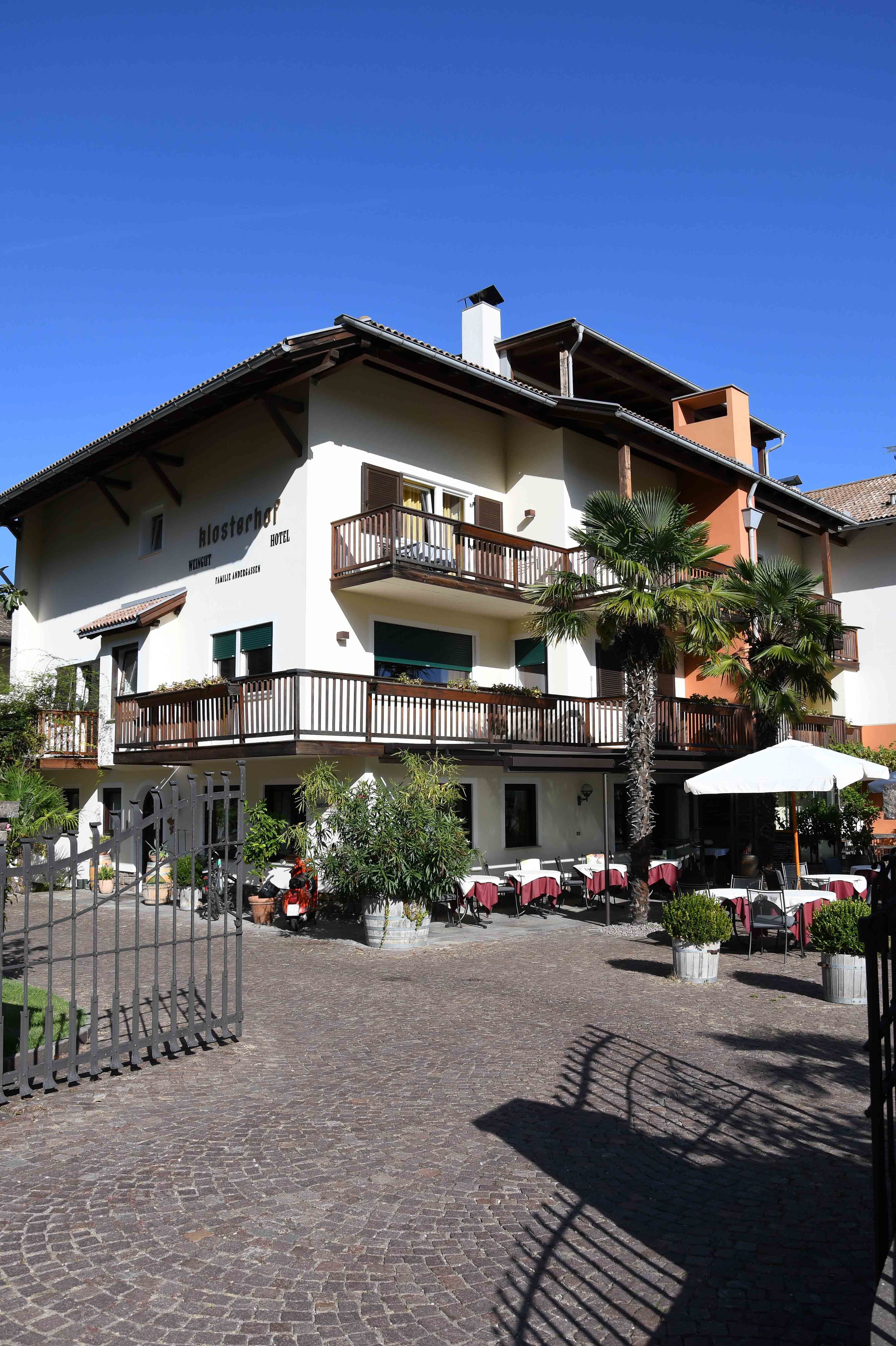 Danach fuhren wir noch zum Weingut Schreckbichl, da fanden wir aber nichts und zum Abschluß gings in die Kellerei in Eppan – da nahmen wir uns noch eine Kisten Goldmuskateller mit. Und somit kam auch unser letzter Urlaubstag so langsam zum Ende. Wir packten unsere Koffer und besuchten am Abend noch Rottenburgerkeller – ebenfalls sehr lecker und empfehlenswert. Und ebenfalls zum Abschluß – die traditionelle Flasche hauseigener Wein im Klosterhof. Es war ein wunderschöner Urlaub – wir hatten viel Spaß, sind viele Kilomenter gelaufen, hatten NUR Sonnenschein und Temperaturen um die 25 Grad und wir haben viel gesehen und erlebt.