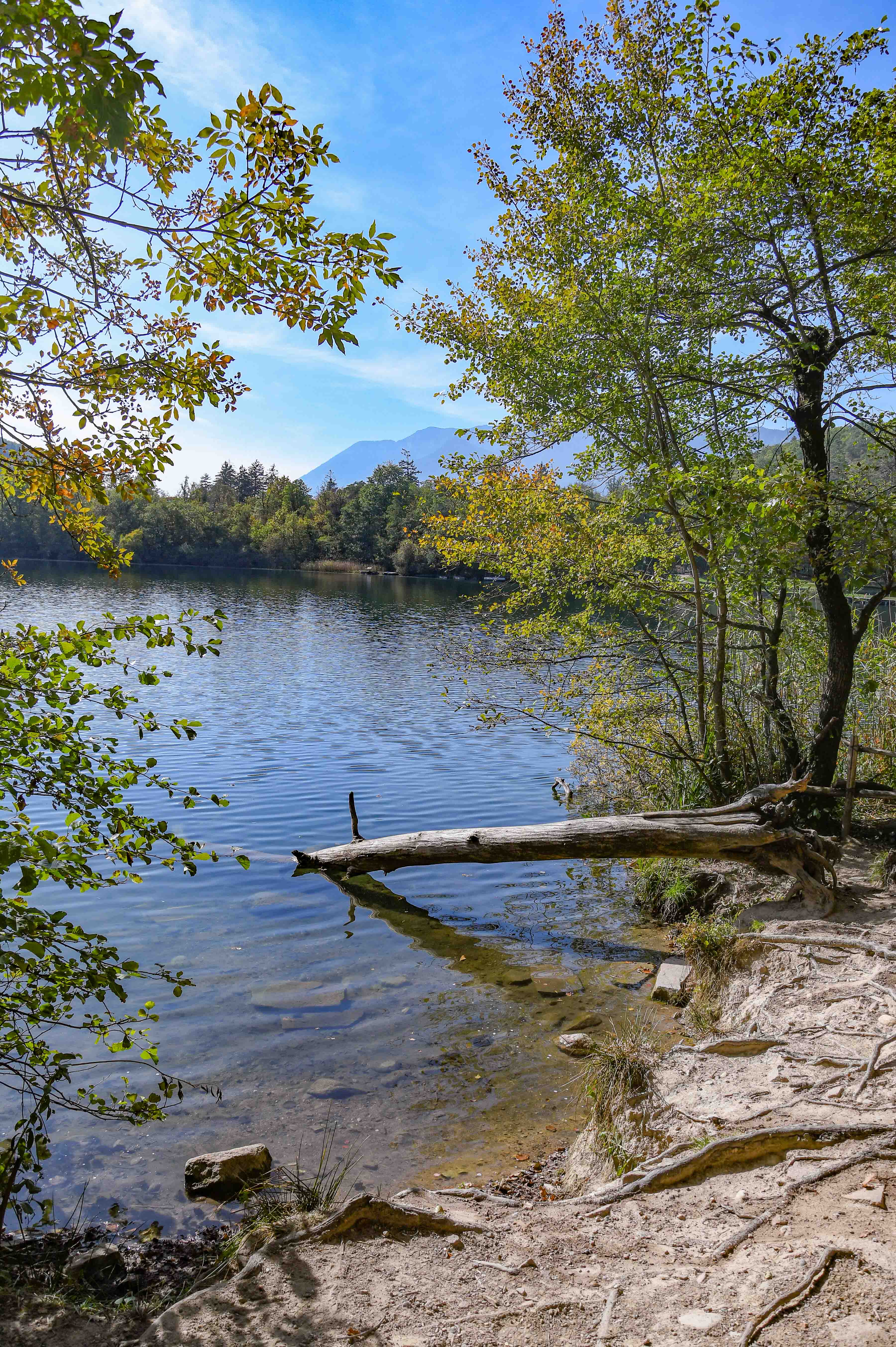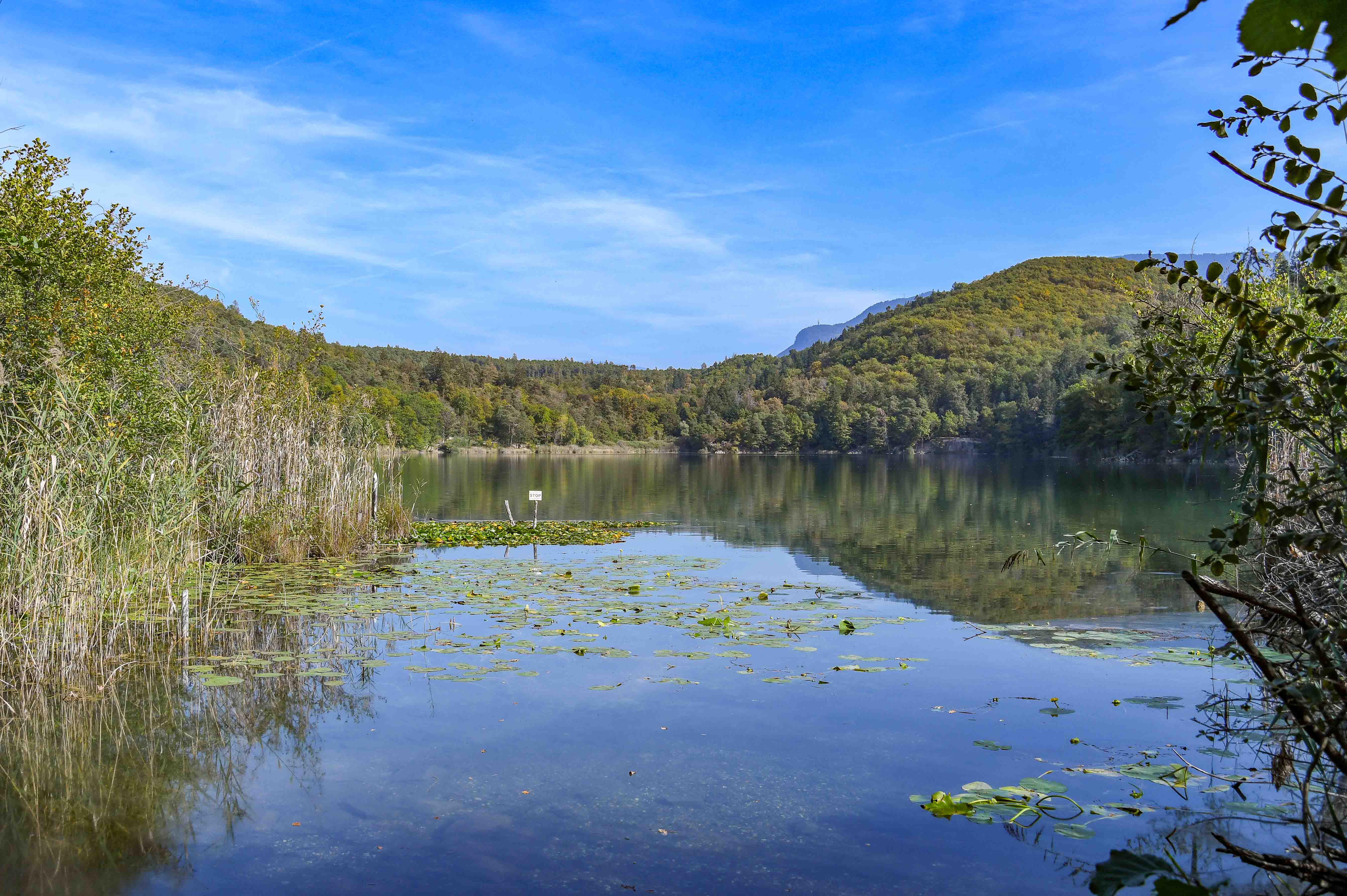 Donnerstags gingen Regina und Stephan zum Golfen – Männe und ich wollten die beiden Montiggler Seen umrunden. Ich kann mich erinnern: vor über 30 Jahren bin ich mal mit 5 meiner Bank-Kolleginnen zum Törggelen nach Eppan gefahren und die Umrundung zumindest eines Sees hatten wir auch gemacht. Und so wußte ich, daß ich im Gegensatz zu unserer Umrundung des Kalterer Sees sehr viel mehr Seeblick haben würde. Dem war dann auch so: