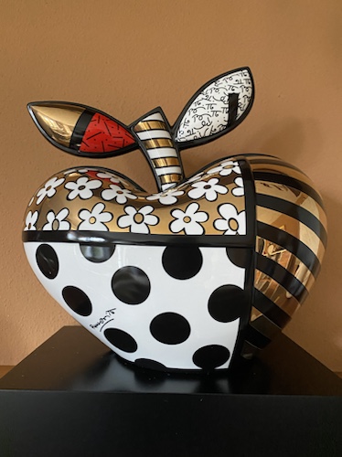 Warum komme ich heute auf Romero Britto? Wir waren am Dienstag am Lago d’Orta in dem kleinen Ort San Guilio und bummelten so durch die engen Gassen dieses wunderschönen Örtchens. Plötzlich standen wir vor einer Galerie, die Werke von Romero Britto ausstellte. Wir sind also reinmarschiert und haben uns umgesehen, haben der Dame unserer Story von dem Künstler erzählt und sie fand sie klasse. Sie selbst hatte ihn auch schon getroffen. Und wie es öfters mal im Urlaub ist, sitzt das Portemonnaie etwas lockerer und schwupps – hatten wir uns einen limitierten „Britto“ gekauft. Und mußten ihn zum Auto schleppen und diesen auch noch in unserem schon knallvollen Auto zur Heimreise unterbringen. Wurde echt eng, alleine unser Hund hat den kompletten Kofferraum für sich. Und wir reisen NIE mit kleinem Gepäck. Aber wir haben alles gut und heil nach Hause geschaukelt.
