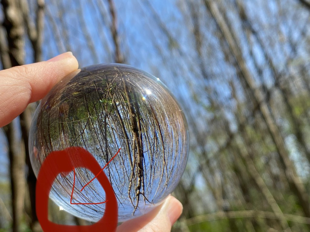 Man muß jedoch höllisch aufpassen. Bei meinem ersten Waldspaziergang vor ca 3 Jahren mit Kugel im Gepäck hätte ich fast einen Baum (und wahrscheinlich damit bald den ganzen Wald) abgefackelt. Ihr wißt ja, wie man mit einer Lupe oder auch mit einer Glasscheibe Feuer entfachen kann – geht mit der Kugel genau so – und noch schneller. Ich habe die Kugel auf einer Astgabel geparkt, bis ich meine Kamera richtig in der Hand hatte und die Kugel „dem goldenen Schnitt nach“ mit der Kamera bzw. für den Bildausschnitt richtig positioniert hatte, hat es schon zu qualmen angefangen!!! Huch – schnell die Kugel vom Ast weggenommen….und natürlich gewartet, ob/was passiert. Nix ist passiert – Glück gehabt.