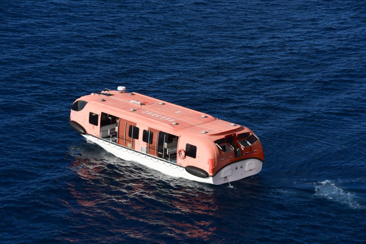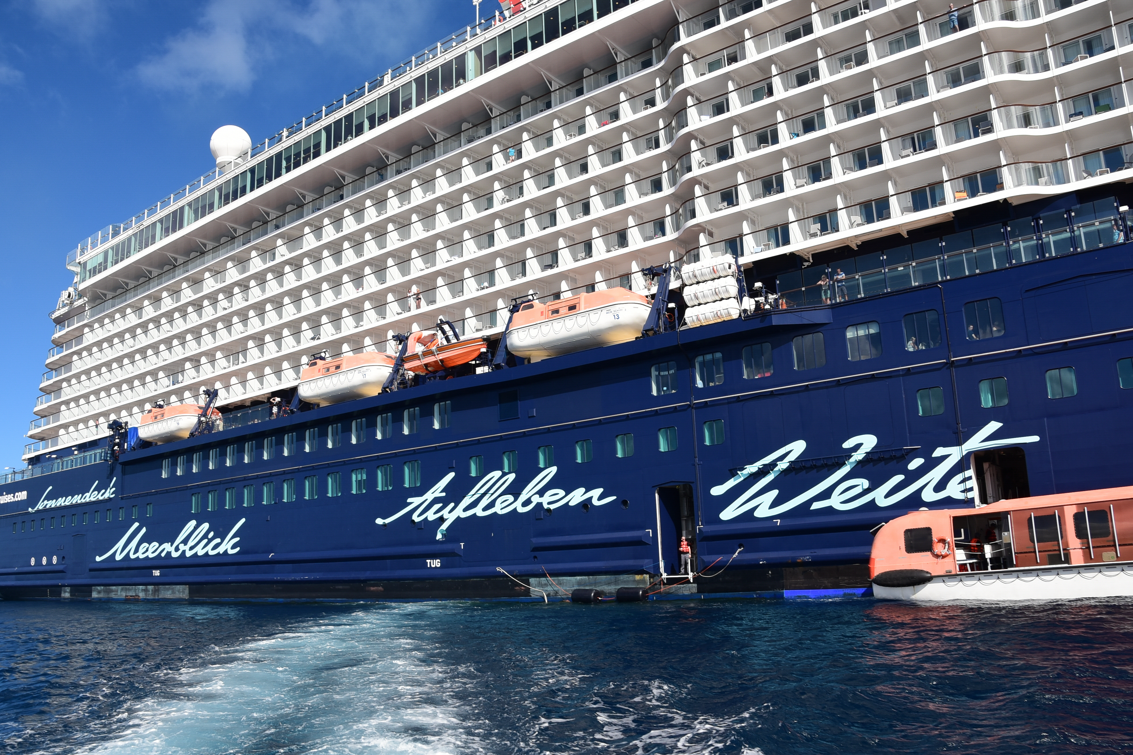 Für uns hiess es früh aus der Koje – Abfahrt mit dem Tenderboot um 07.45 Uhr. Es ist schon ein irres Gefühl, dann in so einem kleinen Tenderboot „unten direkt auf dem Wasser“ zu sitzen und auf das riesige Schiff zu schauen… Man kommt sich recht klein vor…