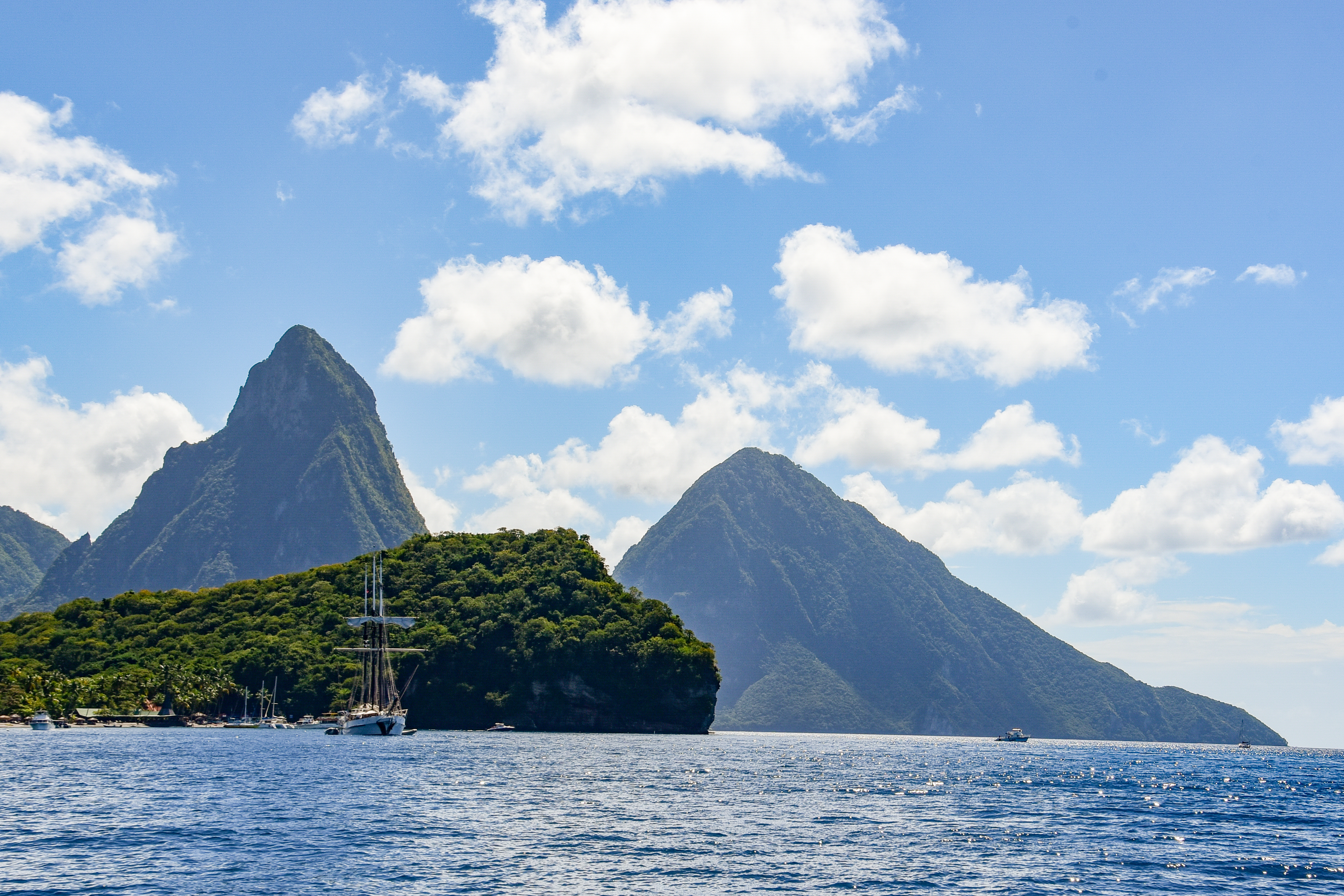 St. Lucia zählt zu den landschaftlich schönsten Inseln der Karibik, dicht bewaldet, Berge, Regenwälder , Kakao- und Bananenplantagen, überall sattes Grün und exotische Blumenpracht. Die Pitons (frz. Bergspitze) sind das Wahrzeichen von St. Lucia. Gros Piton und Petit Piton sind die beiden Vulkankegeln, die es wohl auf fast jedes Urlaubsfoto von hier schaffen.
