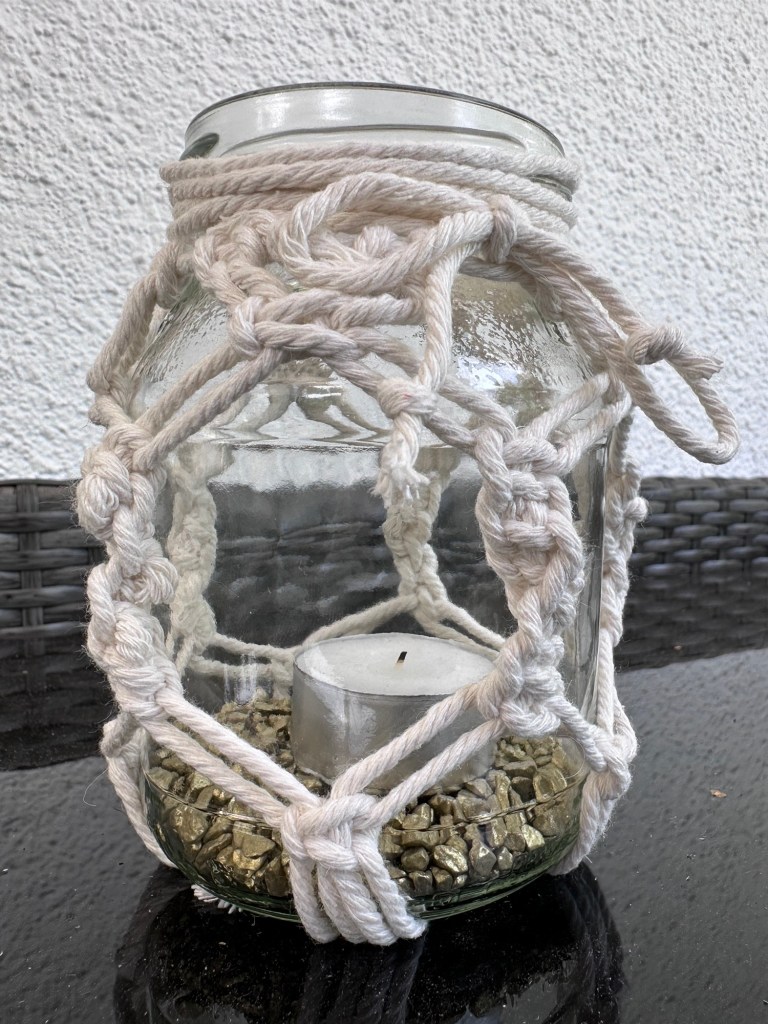 So – und nun ist Sonntag und es regnet und ich werde mich noch ein paar Knoten mit Makrameegarn hingeben 😉