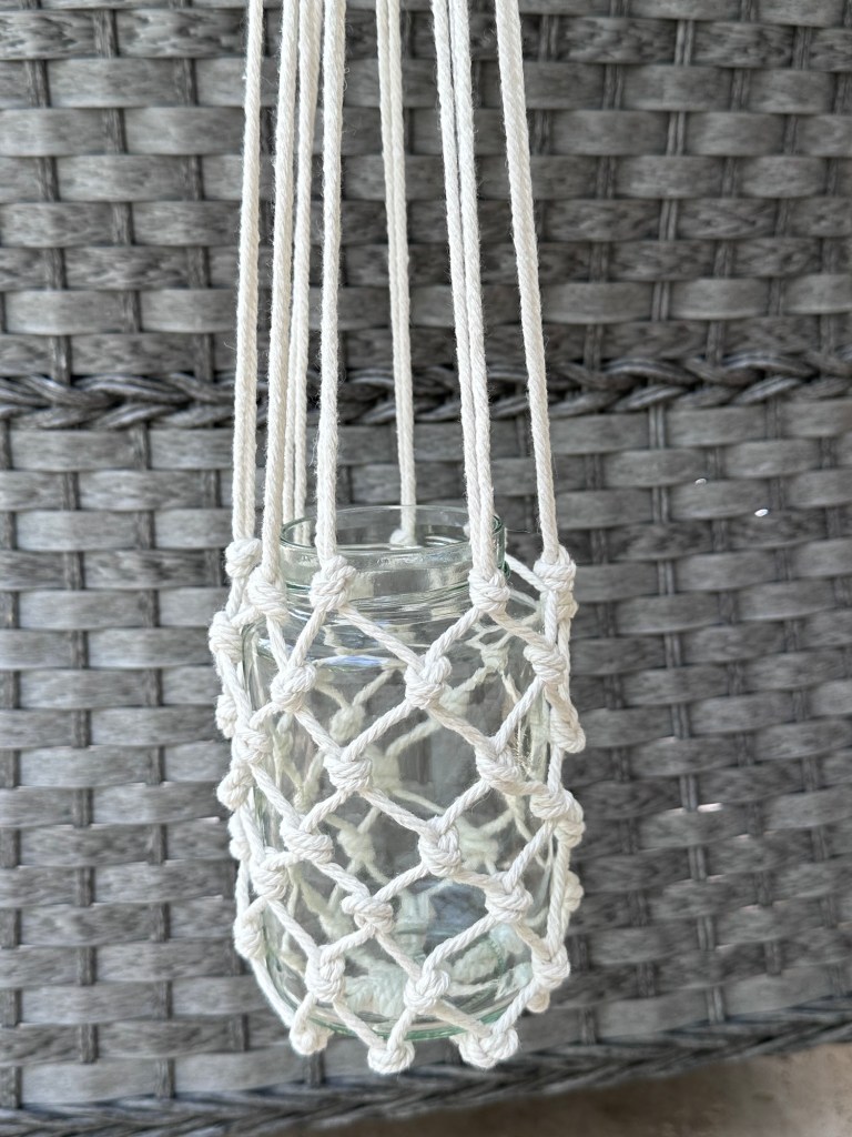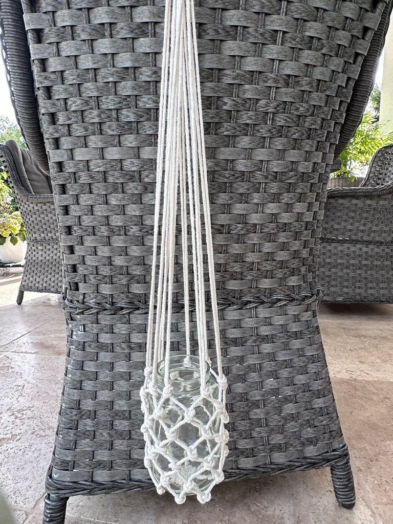 Freitag einkaufen und Wäsche machen – Haushaltskram eben und wie ich so im Garten sitze und mir denke: alles erledigt, was mach ich denn jetzt?, fällt mir mein Makrameegarn ein,, dass ich mir vor Monaten mal gekauft und es dann auch gut verräumt hatte.