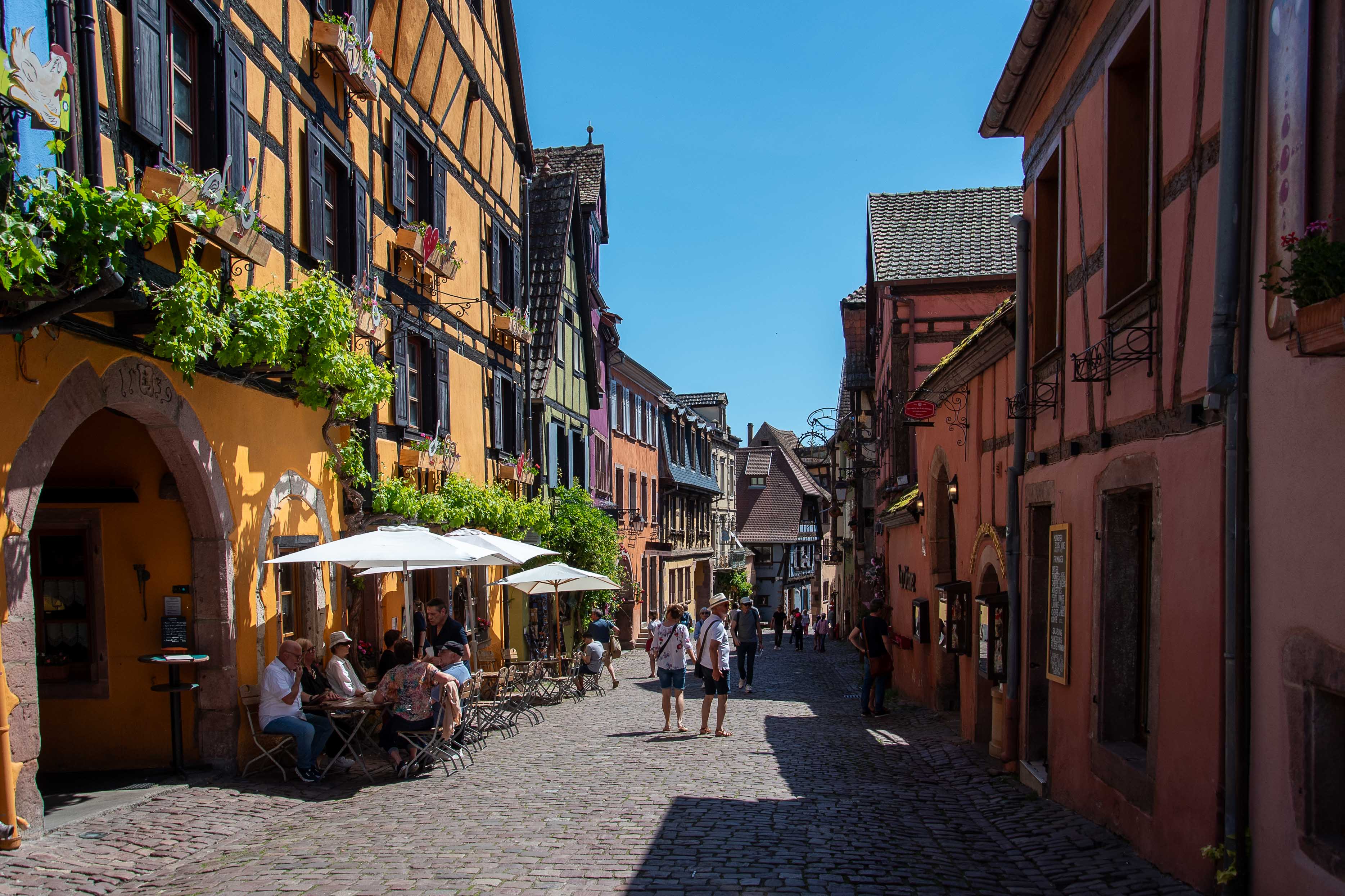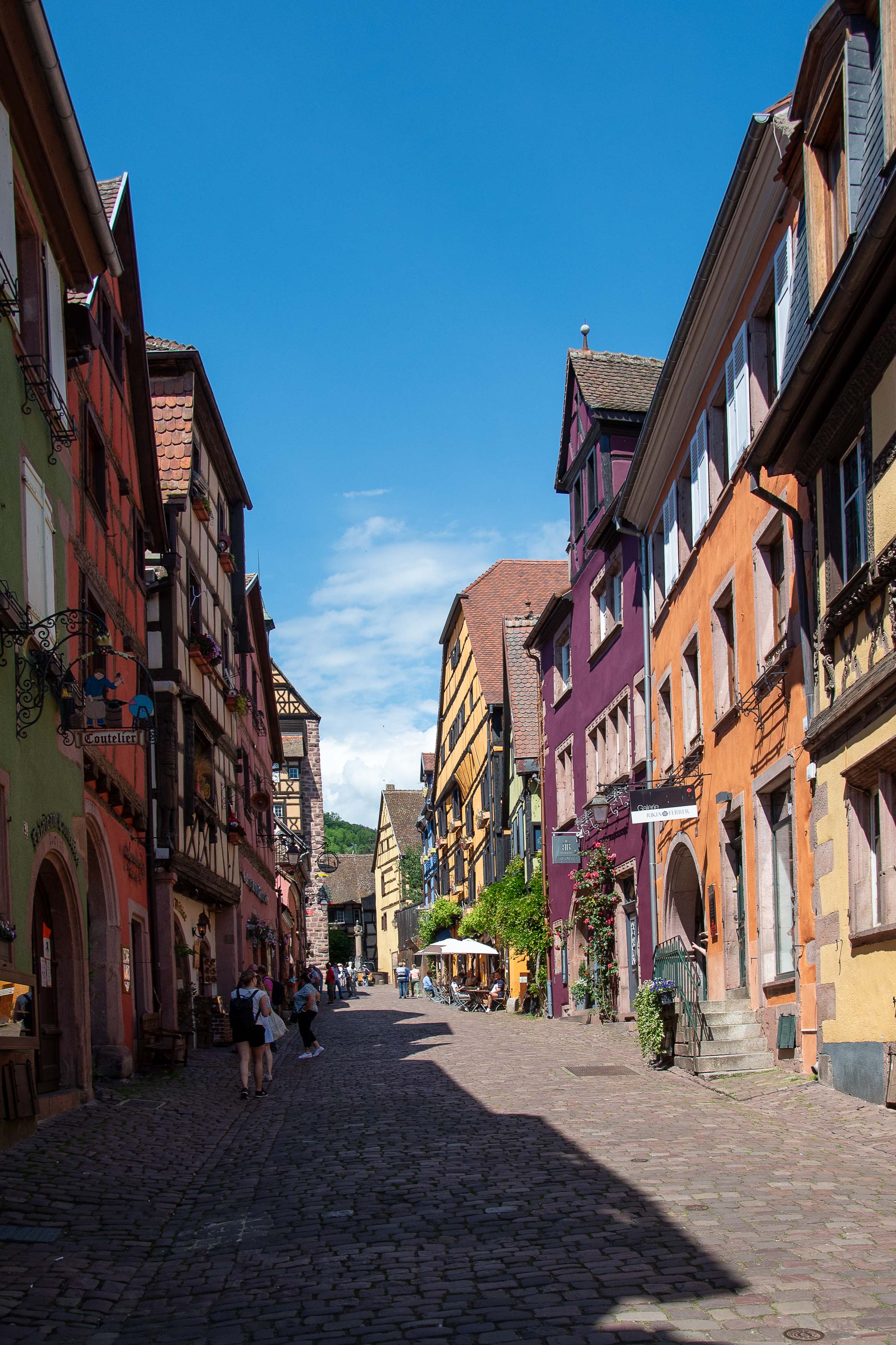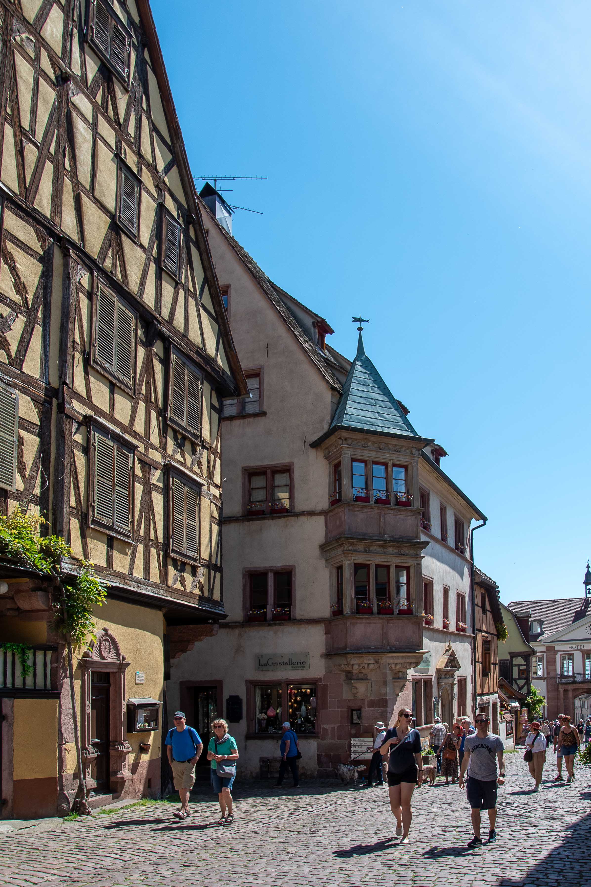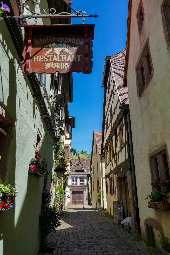 Riquewihr ist einer der attraktivsten und meistbesuchten Orten im Elsass. Und wieder drängen sich hier wunderschöne Fachwerkhäuser aneinander – im Hintergrund und durch die Seitenstraßen bekommt man einen Blick auf die Weinberge.