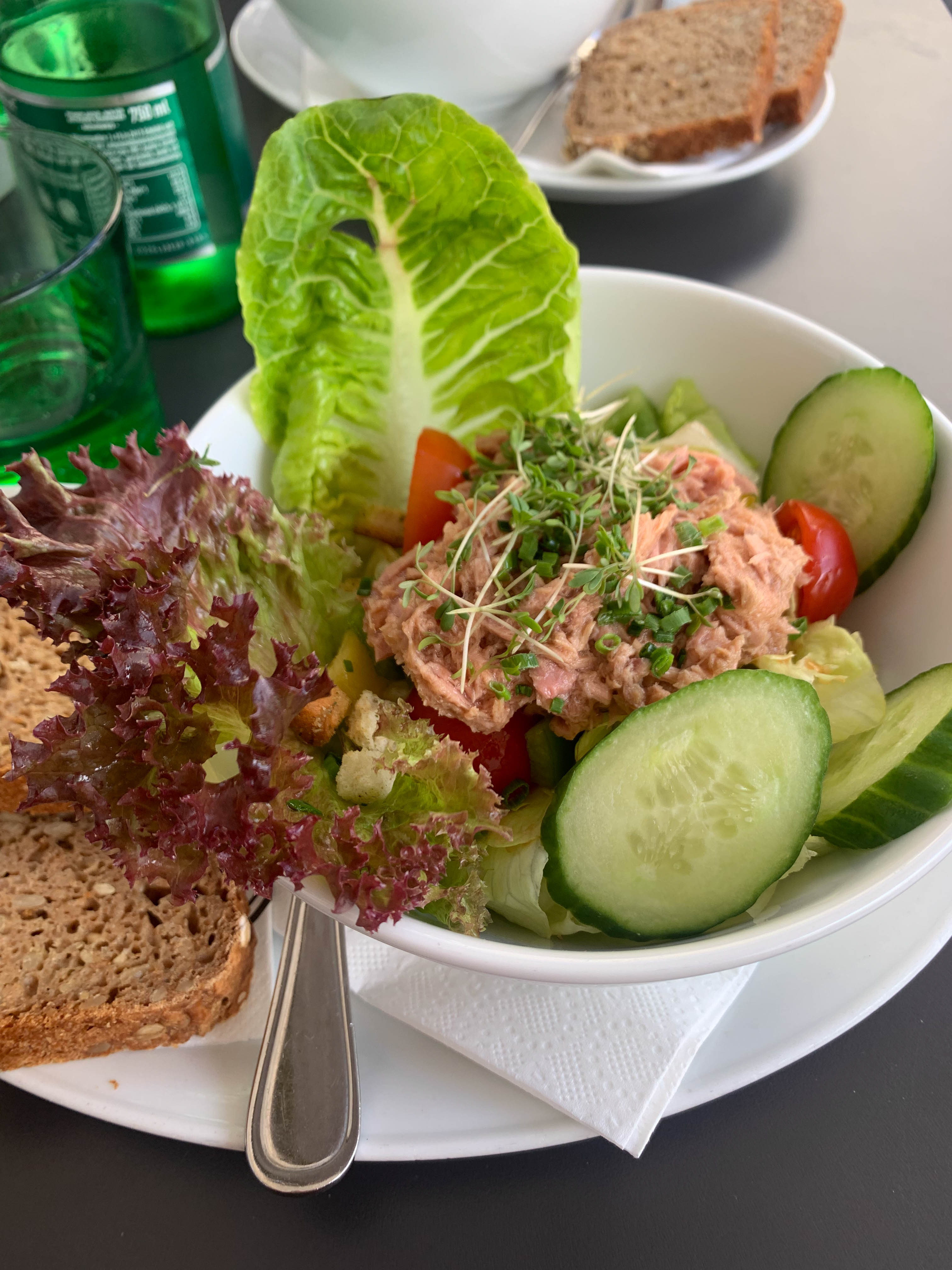 Mittlerweile hatte sich ein kleines Hüngerchen eingeschlichen und wir schauten nach einer Kleinigkeit – im Cafe Reitschule fanden wir ein Plätzchen und gönnten uns jeder einen Salat, ein Wasser und ein Käffchen hinten drauf.