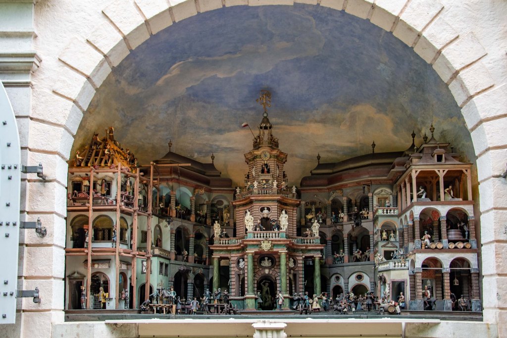 Uns hat ganz besonders das mechanische Theater gefallen. Vor einem turmartigen Palast spielt sich das höfische Leben ab, das Gebäude gibt Blicke ins Innere frei und 141 bewegliche und 52 unbewegliche Figuren beleben die Szenerie. Betrieben wird dieses Theater eben auch mit Wasserkraft.