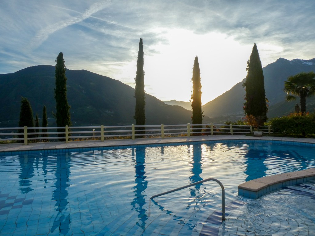 Wir hatten uns im Hotel Rimmele eingemietet – wunderbar zentral gelegen und doch total ruhig mit fantastischem Blick auf Meran. Gegen 19.30 Uhr kamen wir an – schnell Koffer ausgepackt und gleich gegenüber zum Abendessen (unsere Freunde hatten dort in weiser Voraussicht schon einen Tisch reserviert). Hier gab es leckere Südtiroler Küche und natürlich den passenden Wein dazu. In geselliger Runde und Laune hielten wir es da dann noch bis kurz vor Mitternacht aus und fielen dann in die Betten.