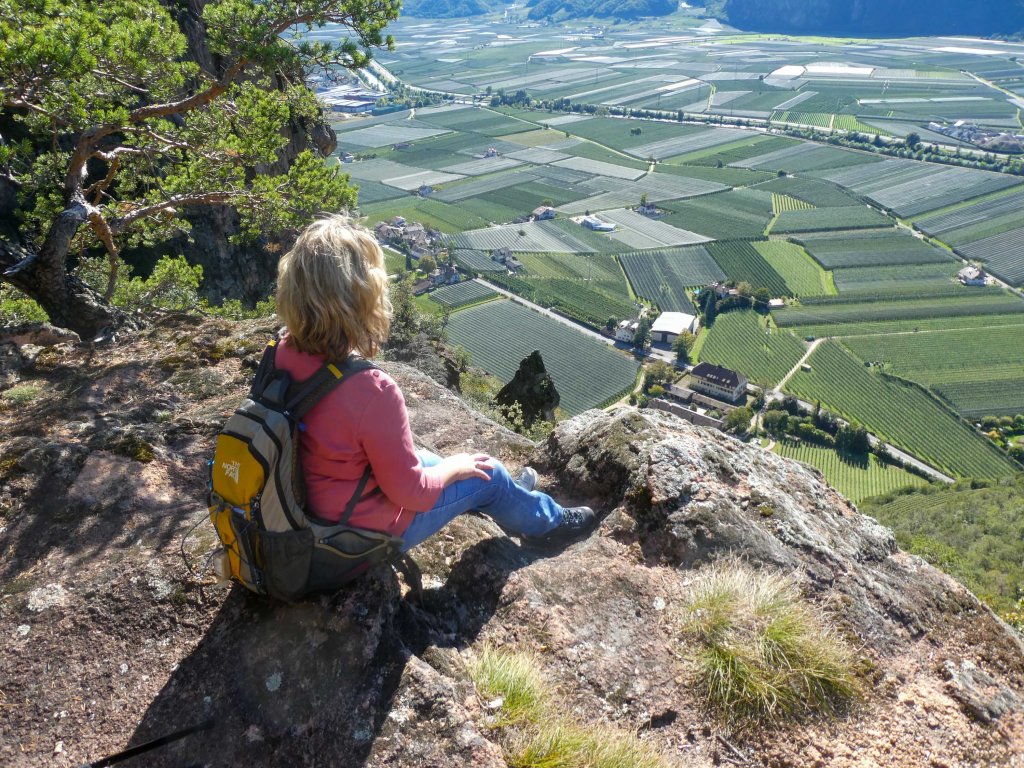 Erdpyramiden bilden sich meist in Moränenlandschaften und entstehen, wenn der Untergrund durch starke Regenfälle aufgeweicht wird und Teile des Hanges abrutschen. Weitere Regenfälle lassen dann Furchen entstehen – dadurch bilden sich Säulen. Bis sich so meterhohe Säulen bilden, vergehen mehrere Tausend Jahre. Das hatte ich im Reiseführer gelesen und diese Erdpyramiden sollte es hier in Dorf Tirol geben. Diese wollte ich sehen – wir marschierten los und die Gruppe trennte sich, weil wir unterschiedliche Ansichten von dem Weg dorthin hatten. Währen die einen stetig bergab ins Tal liefen, marschierten Achim und ich bergauf – und wie – teilweise kam ich mir vor wie an der Chinesischen Mauer und glaubte, steiler kann man gar nicht nach oben laufen, ohne hinterrücks umzukippen. Ich wurde eines Besseren belehrt – man kann. Eine tolle Wanderung entlang des Waalweges durch Obstgüter und Weinberge. Herrlich.