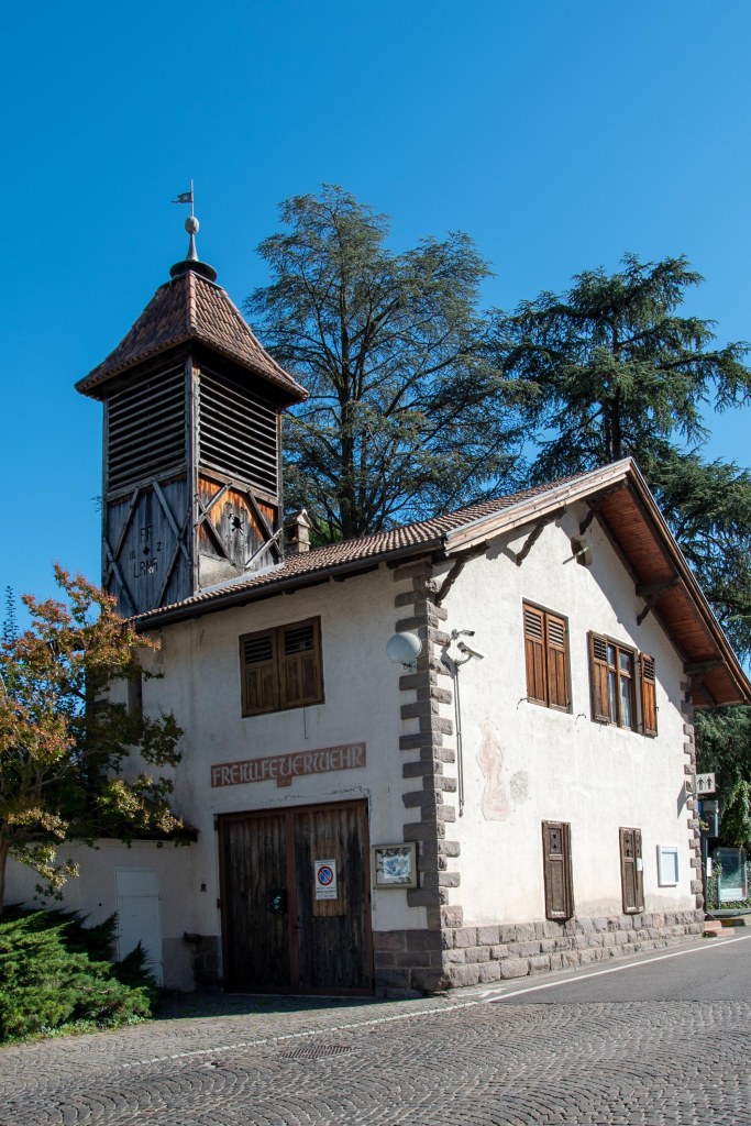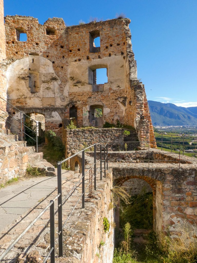 Bevor es zur Ruine ging, marschierten wir erst einmal aufwärts, weil wir einen Ort „Montiggl“ auf der Karte sahen und ich erinnerte mich an einen Mädelsausflug zu den Montiggler Seen. Oben im Ort angekommen, gab es weit und breit keinen See – weder auf der Karte noch mit den eigenen Augen zu finden. Gut – zurück Richtung Burgruine.