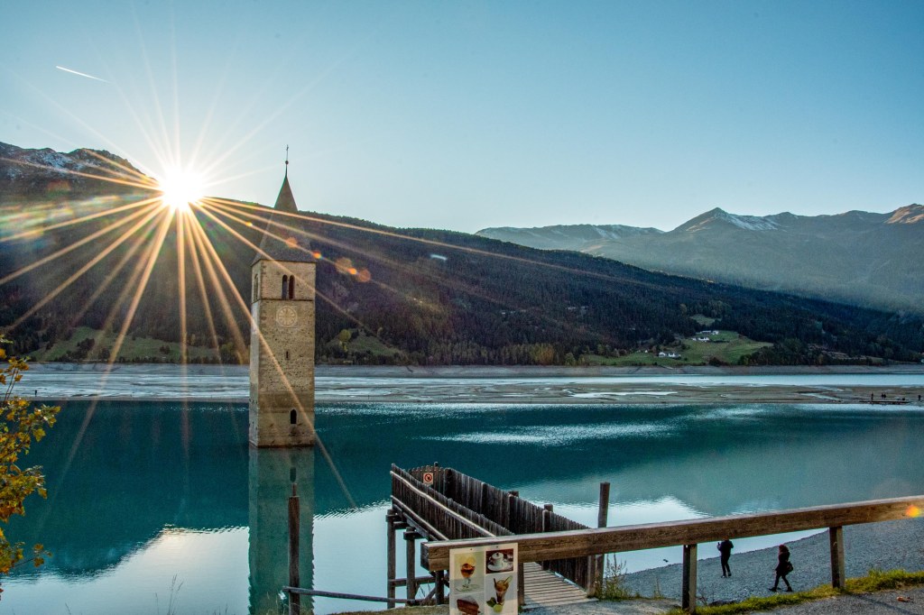 Da war er – unser Abreisetag. Gepack hatten wir schon – jetzt galt es, diverses Wandergepäck und diverse Kisten Wein im Auto zu verstauen. Direkt nach Hause fahren wollten wir nicht, da Samstag immer An- und Abreisetag ist. So beschlossen wir, noch etwas „spazieren zu fahren“ bzw. uns noch ein paar Orte anzuschauen. Wir begannen mit Schenna und fuhren dann über Lana und Schlanders Richtung Reschensee und -pass und dann nach Hause. Es war eine wunderbare Wanderwoche mit vielen Highlights, tollstem Wetter, viel Lachen und Spass und vielen Kilometern zu Fuß.